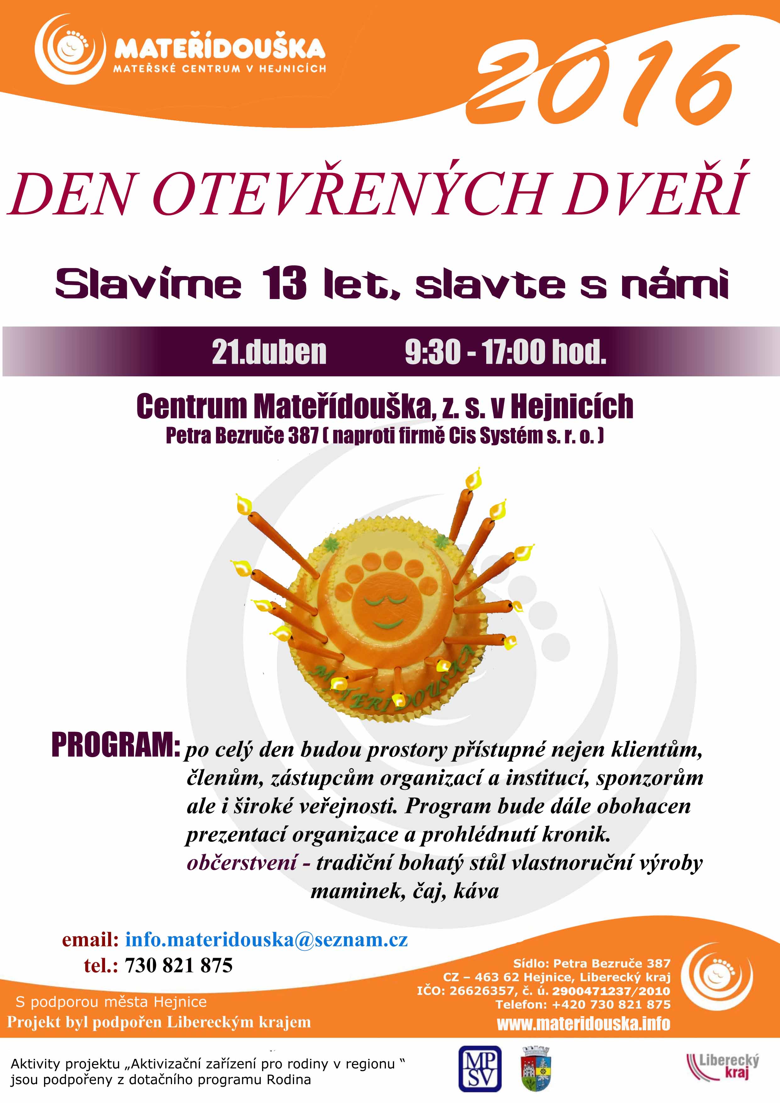 21.4.2016 slaví Centrum Mateřídouška 13 let. Přijďte na den otevřených dveří - od 9:30 do 17:00 hodin