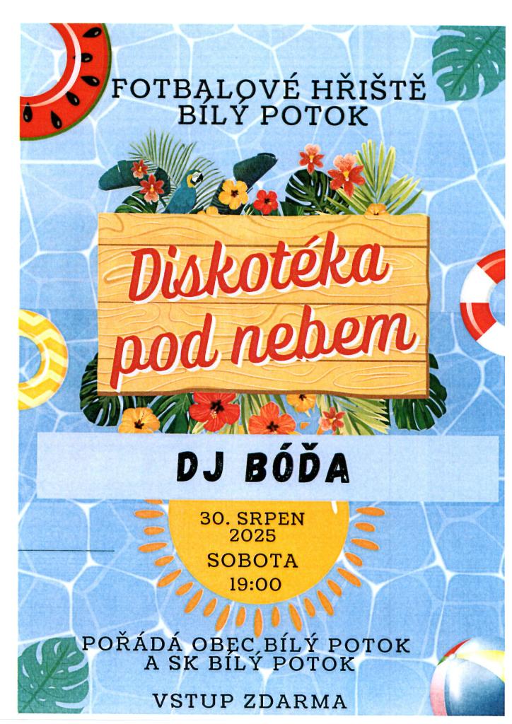 Zveme vás na Diskotéku pod nebem, která se koná 30. srpna 2025 od 19:00 hodin na fotbalovém hřišti. Těšit se můžete na skvělou hudbu od DJ BÓĎY, která vás zve k tanci a radosti.
