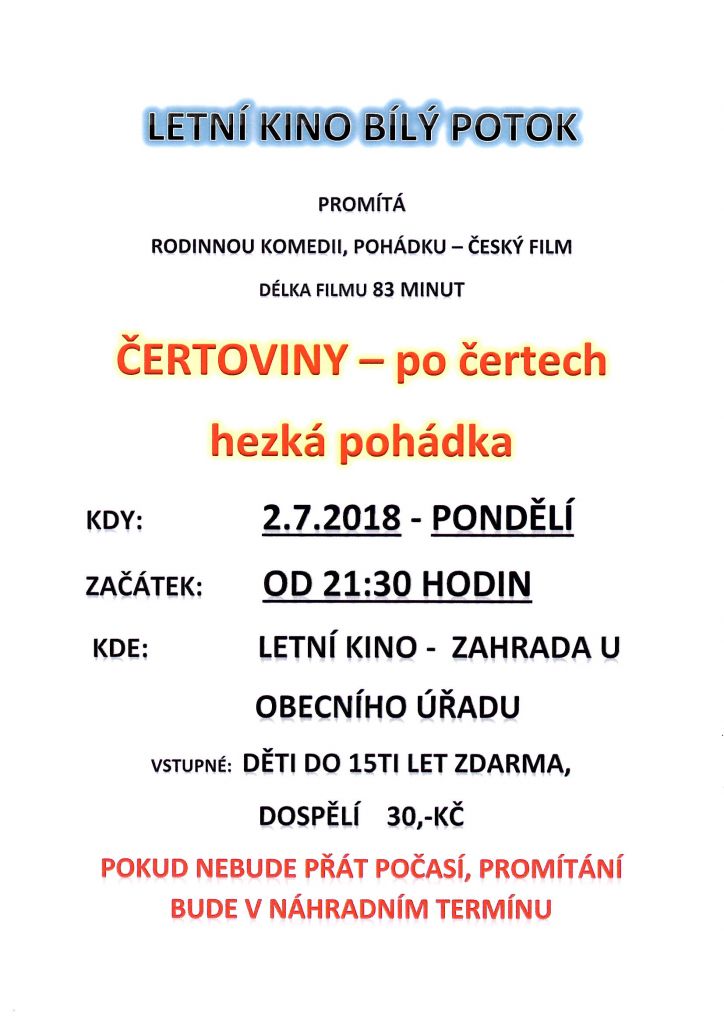 2.7.2018 - pondělí od 21:30 promítá letní kino pohádku ČERTOVINY