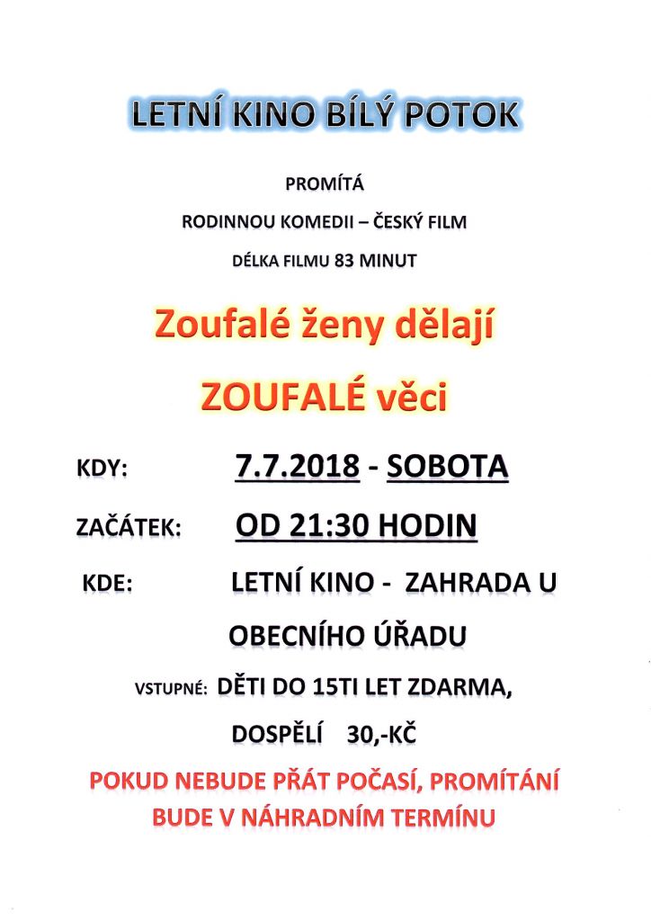 7.7.2018 - sobota od 21:30 promítá letní kino českou komedii " Zoufalé ženy dělají Zoufalé věci" - viz příloha