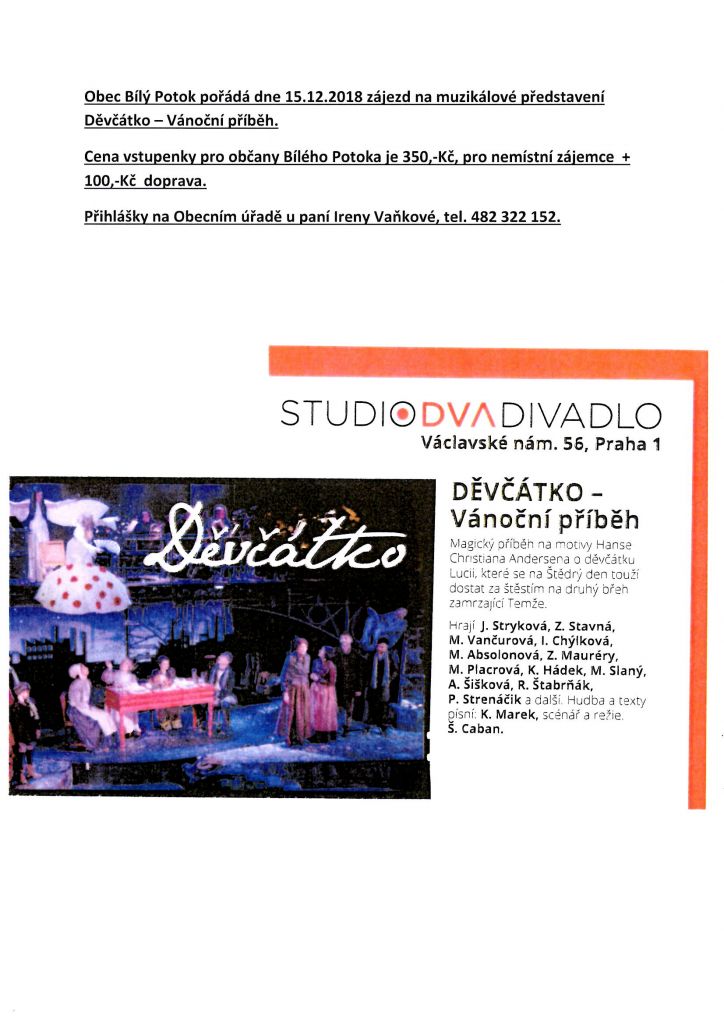 15.12.2018 - STUDIO DVA DIVADLO - Děvčátko - Vánoční příběh - od 11:00 hodin, po skončení možnost návštěvy vánoční Prahy
