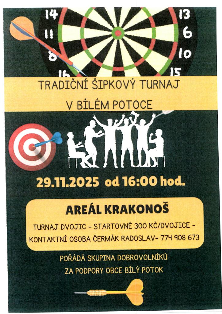 Tradiční šipkový turnaj se koná 29. listopadu 2025 v penzionu Krakonoš v Bílém Potoce. Turnaj je určen pro dvojice, startovné činí 300 Kč. Přijďte si užít zábavu a soutěžit s ostatními.