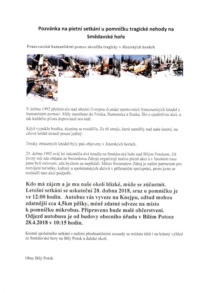 28.4.2018 se můžete zúčastniti výletu na Smědavskou horu k pomníčkům letecké nehody, která se stala 23.4.1992 - více přiložená pozvánka